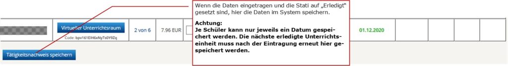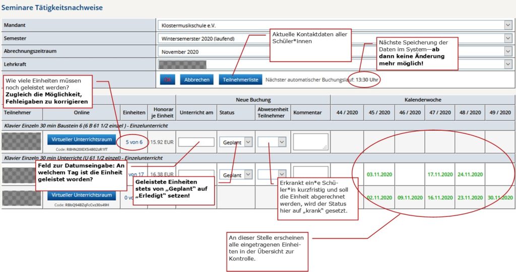Die geleisteten Unterrichtseinheiten sollten spätestens bis zum 2. des Folgemonats eingetragen werden, damit eine zeitnahe Abrechnung erfolgen kann.
