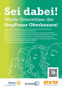 Seit über vier Jahren läuft an vier Oberhausener Schulen das Projekt SingPause. Knapp 1000 Kinder lernen hier nachhaltig Singen, Musikalität und das Singen zu lieben. Von der Pfarrei St. Clemens und dem Rotary Club Oberhausen ins Leben gerufen konnte das Projekt mit Mitteln des Pastoralen Innovationsfonds des Bistums Essen angeschoben werden.